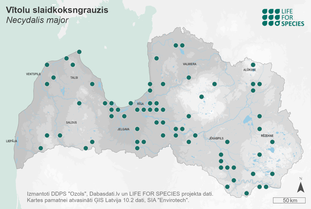 Summary. Longhorn beetle – Necydalis major. A Palaearctic species, distributed from Western Europe to eastern Asia. Latvia is located in the central part of the distribution range. In Latvia, more than 100 sites are known in different parts of the country. The EOO is 65,157 km2, and the AOO is 564 km2. The European regional population is considered stable. Population size and trends in Latvia are unknown. N. major inhabits birch and black alder forests. This is a saproxylophagous, stenotopic species. Larvae develop in standing decaying trunks of deciduous trees, mainly Silver birch and Aspen. The main threat is the reduction of decaying wood and melioration of forests. Threats will have a limited impact on the Latvian regional population in the next ten years. It is necessary to preserve decaying wood in forests, as well as to conduct studies on the population and distribution to clarify the impact of threats and the trends and size of the population. The species AOO meets the threshold for the category of Endangered (EN), but it is assessed as Near Threatened (NT) because the threat impact is limited and the population is unlikely to decline significantly within the next decade. The species is on the national list of protected species. The protection status of the species is proposed to be reviewed.