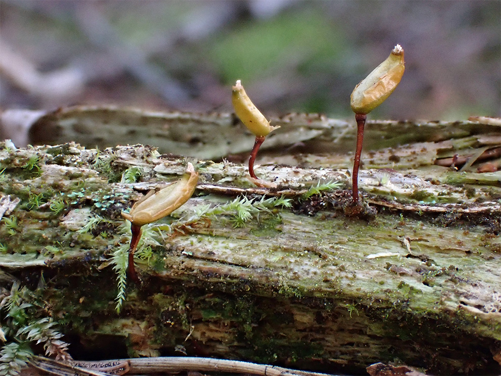 Summary. Green shield-moss – Buxbaumia viridis. A widespread moss throughout the northern hemisphere (Eurasia, North America, most of Europe except the southern part). It was first found in Latvia by U. Suško in 1996. There are more than 100 known localities found throughout Latvia in the last 20 years, with smaller numbers in Latgale, Selonia and Zemgale. There are about 225 records of the species in Latvia, 27 of them with mature individuals (one tenth), with an estimated 700–800 breeding individuals. EOO is 62,890 km2, and AOO is 520 km2. The distribution and population dynamics of the species are unknown, because, with the exception of 2021, so far only localities where sporophyte has been found have been included in the monitoring of the species in Latvia. The condition of these localities is stable, but sporophyte recurrence has not been observed in all of VU them. Usually there are one to five sporogons per subpopulation, rarely more. The species grows on decaying wood in coniferous forests, most often in species-rich spruce forests with deciduous trees on both fallen logs and stumps, usually in late decomposition. The species is threatened by forestry activities and removal of decaying wood, inundation of localities and potential substrates, and removal of trees and shrubs. It is assessed as Vulnerable (VU) due to its very small population (in terms of individuals capable of reproduction). A species of EU significance and protected species in Latvia – micro-reserves can be established to conserve its habitats. The legal status of the species should be maintained. The species has been found in several protected nature territories – the “Ances purvi un meži” and “Vidusburtnieks” Nature Reserves, the Gauja and Slītere National Parks and the “Abavas senleja” Nature Park. Monitoring of the species should be continued to investigate long- term population dynamics.