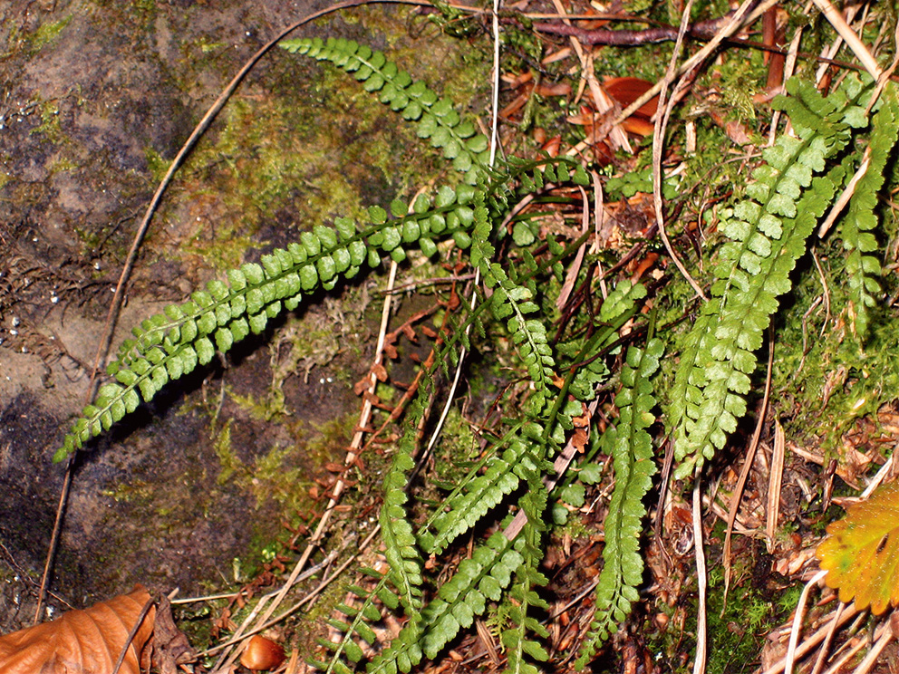 Summary. Green spleenwort – Asplenium viride. In Latvia, the species was found in 2016 for the first time, and then again in the same locality in 2021 (one individual, in the Gauja National Park). Both the AOO and the EOO are 4 km2. The species is probably present elsewhere in Latvia. In its only known locality, A. viride was found in a spruce-linden-aspen forest on old debris in a dolomite quarry, in a ravine. The only site of the species in Latvia is currently threatened by logging. Climate change may be a threat in the future, as cool summers are optimal for the species. Targeted surveys of the species in suitable habitats are necessary. Logging should not be permitted in the localities of A. viride. This species should be included on the list of protected species of Latvia.