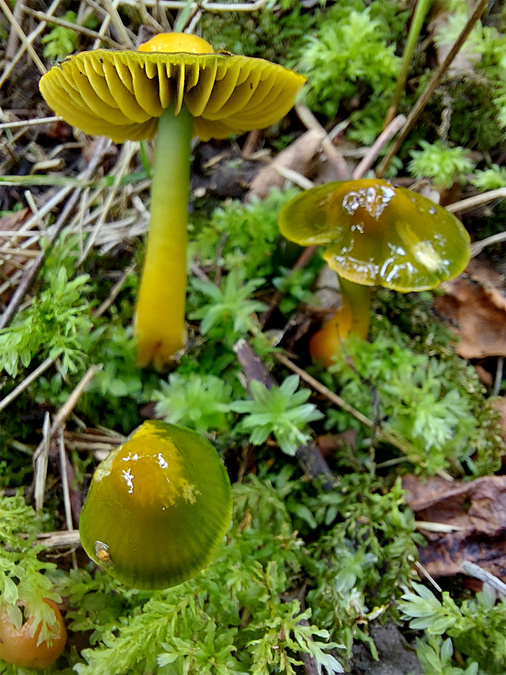 Summary. Parrot waxcap – Gliophorus psittacinus. Grows in Europe, North America, parts of Asia, Australia, and South America. It is common in the temperate zone in Europe. It is very rare in Latvia with four localities recorded in the Vidzeme and Kurzeme regions up to 2022. The EOO is 2,951 km2, and the AOO 16 km2. Data on the regional population size and changes in Latvia are lacking. The exact number of mature individuals is not known, but is probably around 100. It is a soil saprotroph. In Europe, it occurs in semi-natural grasslands, pastures, park lawns, open areas in deciduous forests. In Latvia, it is found mainly in open areas (with grasses) in broadleaved forests. Grasslands are a possible habitat for this species, but there have been no studies on fungi in grasslands in Latvia, and very little is known about them. Globally, it is threatened mainly by changes in grassland management (fertilisation, herbicide use, afforestation, etc.), loss of pastures, excessive mowing or no mowing of park lawns. In Latvia, the distribution of the species is affected by the lack of suitable habitats. It is assessed as Vulnerable (VU) due to a very small regional population. The species is not listed as a species of EU importance and is not protected in Latvia. It is proposed to be included on the list of protected species. It is found in protected nature areas – the Gauja National Park, and the Moricsala Strict Nature Reserve. The main conservation measures include: the conservation and restoration of suitable habitats, mainly semi-natural grasslands, maintenance of gaps in broadleaved forests, and public education.
