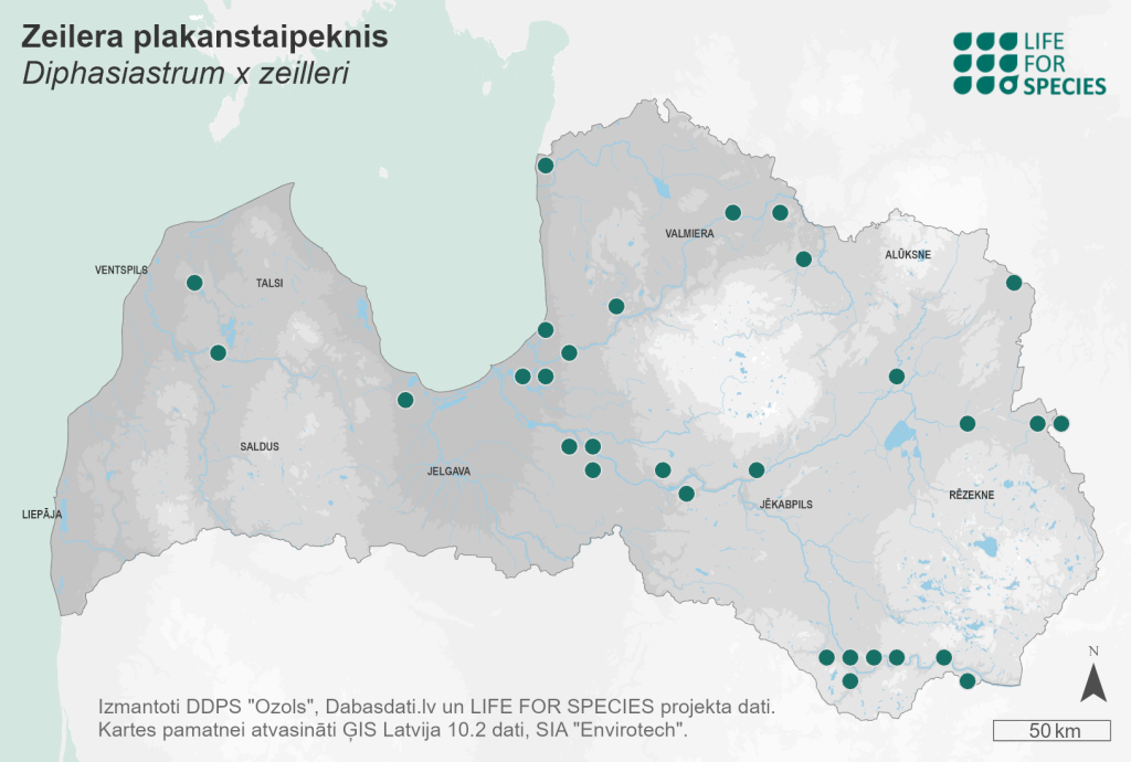 Summary. Diphasiastrum × zeilleri is a species with an unknown range. It is often misidentified as another Diphasiastrum species (D. complanatum or D. trystachyum) or subspecies. The species is rather rare in Latvia. Data may change after a country-scale survey and surveys of local floras. The AOO is 148 km2, and the EOO – 49,500 km2. The species’ distribution is fragmented. There are no reliable data on changes in the AOO and the EOO. The number of recorded localities is between 59 and 114. In many places, the species may be misidentified as D. trystachyum or D. complanatum, which would lead to an increase of D. × zeilleri records and a decrease of the number of the other species accordingly. In Latvia, D. × zeilleri usually occurs in dry pine forests, often in managed young and middle-aged forests. Only 22% of the known localities occur in protected areas: in the “Ādaži” and “Ziemeļgauja” Protected Landscape Areas, the “Salacas ieleja” Nature Park, the “Posolnīca” Nature Reserve and other territories. The main threats are the reduction of burnt forest areas, natural succession in dry pine forests resulting in the change of species’ composition, and intensive forestry operations including clearcutting, sand and gravel quarrying, recreation and forest fragmentation. It is recommended to include D. × zeilleri on the list of protected species in Latvia.