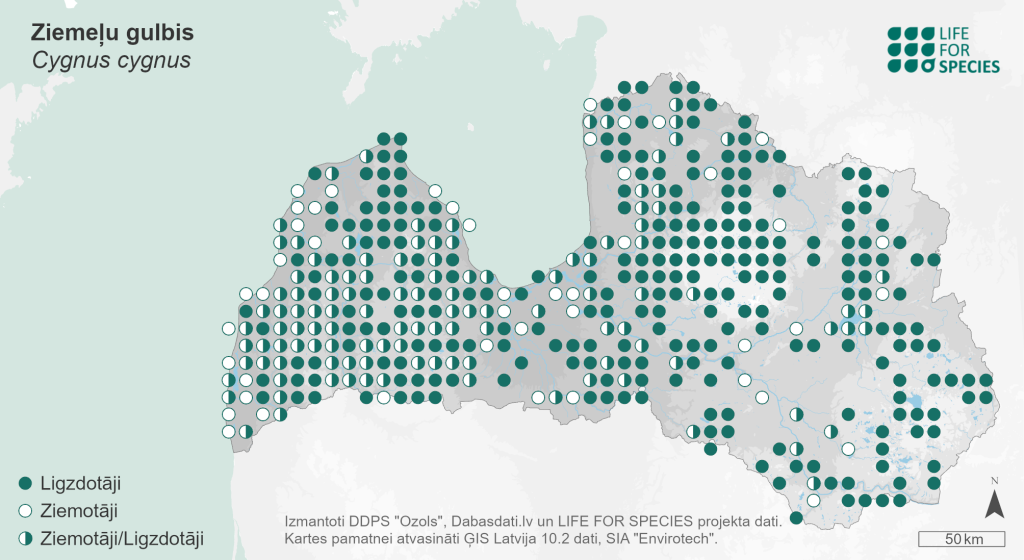 Summary. Whooper Swan − Cygnus cygnus. In Latvia, the breeding distribution increased rapidly between 1980–1984 and 2000–2004, as well as between 2000–2004 and 2013–2017, with the species spreading from Kurzeme Region throughout the entire of Latvia. The AOO of breeding birds is 3,600 km2, the EOO – 80,104 km2. The breeding population is estimated at 430–600 pairs (860–1,200 adult individuals). The population is increasing in the long term as well as in the short term. The AOO of the wintering population is 1,196 km2, the EOO – 66,436 km2. The average wintering population is estimated at 388 individuals (259 adult individuals). The wintering population is increasing in the long term, while the short-term trend of the population is unclear. It inhabits a variety of ponds and lakes, including wetlands. The species winters in a variety of unfrozen waters, including the sea. The species is threatened by habitat degradation and loss due to an increase in agricultural intensity and wetland drainage, mortality on roads and power lines, as well as lead poisoning. Avian influenza outbreaks could also be a potential threat to the species. Revision of the legal status of species protection in Latvia is possible. Preservation of wetlands on agricultural land is required to conserve the habitat. Conservation of the species requires effective control of the ban on lead ammunition in wetlands. The use of fishing weights containing lead should be banned. Fishing waste must be kept from being disposed of in water bodies. Power lines, where they pose a threat to Cygnus spp., need to be equipped with elements that improve their visibility.