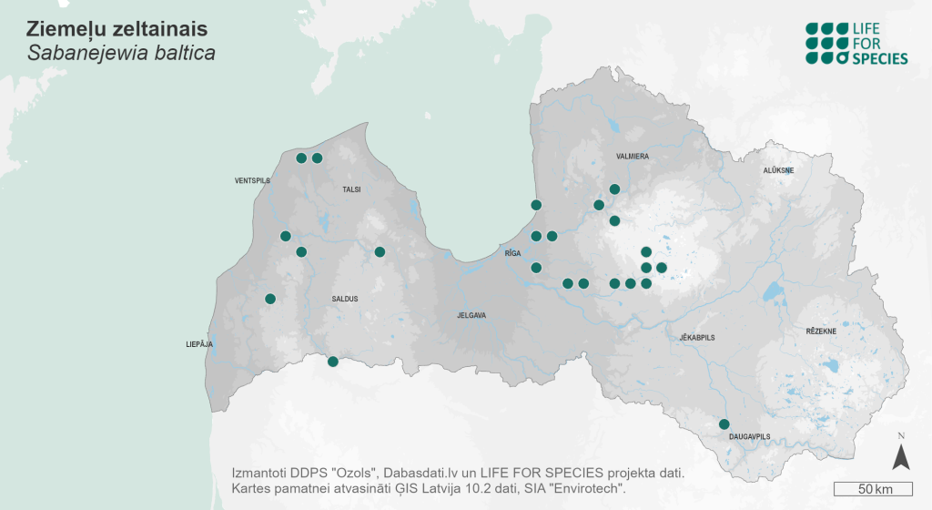 Summary. Northern golden loach – Sabanejewia baltica. In Europe, the species is found in the Black Sea catchment – Dniester, Dnieper and Don basins, and also in the Baltic Sea catchment – in the Vistula and Odra rivers in Poland, and the Venta, Šventoji (a tributary of the Neris), Minija and Muse rivers in Lithuania. Latvia is considered to be the northern limit of the species' distribution. The species has been recorded in nine rivers, with the widest distribution in the Ogre, Gauja and Amata rivers. It has also been recorded in Lake Košu. The EOO is 32,899 km2, and the AOO – 136 km2. Since the first record in 2008, the occurrence has not decreased. Populations are fragmented in most rivers within its range. The average number of individuals per unit area (100 m2) in Latvian rivers where it occurs is 2.6 and can exceed 10 in suitable habitats. Due to its fragmented regional population and small AOO, the species is assessed as Near Threatened (NT). It inhabits running water habitats with clear water and sand or gravel substrates with sparse vegetation. It is usually absent from large lowland rivers and has no known threats at a global and regional level. In Latvia, threats have not been studied and the main threats are considered to be riverbed alterations (excavation, pumping), changes in hydrological regime, eutrophication and chemical pollution. It has been recorded in five protected nature areas – the Gauja National Park, the «Ventas ieleja” and “Ances purvi un meži” Nature Reserves, and the «Abavas senleja» and «Ogres ieleja» Nature Parks. It is a species of EU importance and must be included on the list of protected species in Latvia. Targeted studies on the size, distribution and trends of the Latvian regional population are needed, using both traditional fish survey methods and environmental DNA methods.