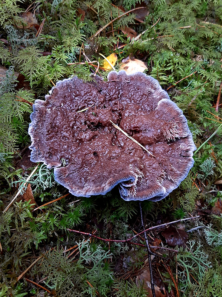 Summary. Blue tooth – Hydnellum caeruleum. Distributed across Europe, Asia, and North America. In Europe, it is found in many sites, but rare everywhere. It is relatively rare in Latvia, with more than 40 known localities in different regions. The species is thought to be more widespread. The EOO is 22,706 km2, and the AOO – 108 km2. There are no data on the regional population size and change. The estimated number of mature individuals is 180–270. It grows on the ground and forms mycorrhiza with conifers, most commonly pines, but also spruces. Found in coniferous forests. In Latvia, the species grows mostly in undisturbed dry pine forests on sandy soils near old pines. It is threatened by the reduction of old coniferous forests, soil disturbance (caused by forest machinery), and forest encroachment by shrubs and broadleaves due to eutrophication. The species is assessed as Vulnerable (VU) due to its very small population. It is not included in the EU or Latvian lists of protected species. The legal status of the species does not need to be changed. It is found in several protected nature areas, e.g. the Ķemeri National Park, as well as in coastal forests. In order to protect the species, old pine forests or groups of old pines should be preserved, large continuous clear-cuts should be avoided, and the ground cover under old growing pines should be disturbed as little as possible. Research is needed on the distribution, ecology and threats to the species.