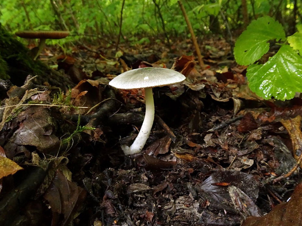 Summary. Slaty rosegill – Volvariella caesiotincta. Mainly found in Europe, but very rarely in North America, and Australia. It is rare in temperate and hemiboreal zones in Europe, and very rare in the southern boreal zone. It is very rare in Latvia; by 2022, five localities have been found in the Vidzeme and Kurzeme regions. The EOO is 65,653 km2, and the AOO – 20 km2. No information is available on the distribution changes due to a lack of studies; insufficient data on the regional population size and changes. The number of mature individuals is likely to be less than 250. It is a wood saprotroph found in deciduous forests on heavily decayed wood such as stumps and fallen trees. The distribution is affected by the removal of dead wood from deciduous forests and by the decrease in the proportion of broadleaved forests. It is assessed as Endangered (EN) due to very low AOO, a very small, fragmented regional population, and the expected decline. The species is not listed as a species of EU importance and is not protected in Latvia. It is proposed to be included on the list of protected species in Latvia. It is found in a protected nature area – the “Gaiziņkalns” Nature Park. Other localities are outside protected areas. The conservation of the species requires the preservation of dead wood of deciduous trees in forests. Further search for new localities in Latvia is needed to determine the regional population size and trends, and studies on distribution life cycle and ecology.