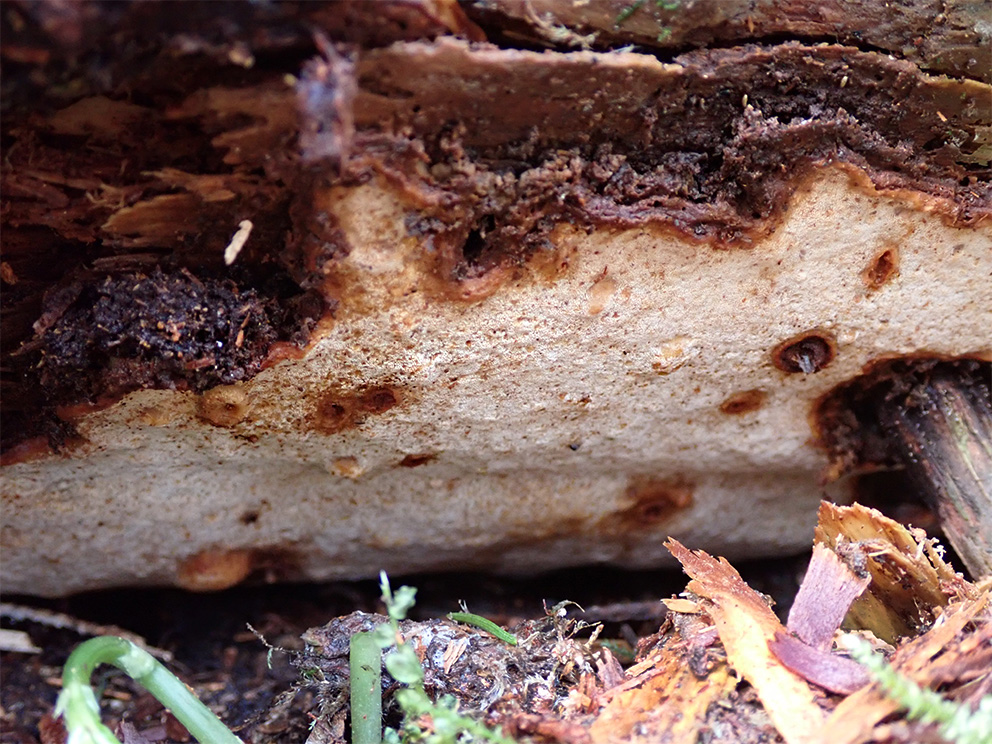 Summary. Stellate porecrust – Skeletocutis stellae. Occurs in Eurasia, and North America. In Europe, it is found mainly in the boreal zone. It is relatively rare in Latvia, with 109 known localities. The EOO is 50,627 km2, and the AOO – 224 km2. There are insufficient data on the regional population size and changes. The number of mature individuals is about 440. It is a wood saprotroph, causing white rot. It grows on medium to large (at least 20 cm diameter) spruce or pine logs in moderate to relatively advanced stages of decay. It occurs in undisturbed natural coniferous forests. The species is threatened by the decrease in the area of old coniferous forests, the decrease in the amount of dead wood and coarse woody debris in the forest. It is assessed as Vulnerable (VU) due to its small regional population and habitat requirements. Not included in the EU or Latvian lists of protected species. It is proposed to be included on the list of protected species in Latvia. About a quarter of the species’ regional population is found in protected nature areas, e.g. the Gauja and Slītere National Parks, and the “Vjadas meži” Nature Reserve. In order to protect the species, it is necessary to preserve suitable habitats and ensure their development in the future. Research on the species’ occurrence, ecology and threats is needed.